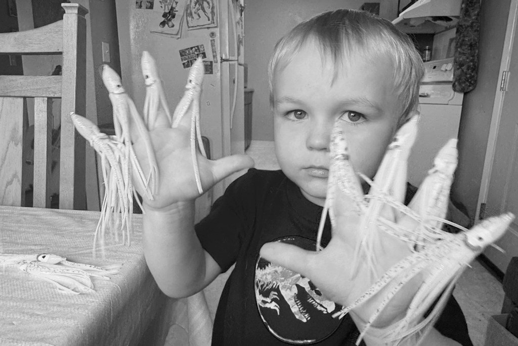 Side note before we dive into it: If you’re wondering what those dangly things are in the picture—yes, those are fishing hoochies. Odin has loved them since before he was even two. Forget stuffed animals… give that kid a tackle box of hoochies and he’s happy.
