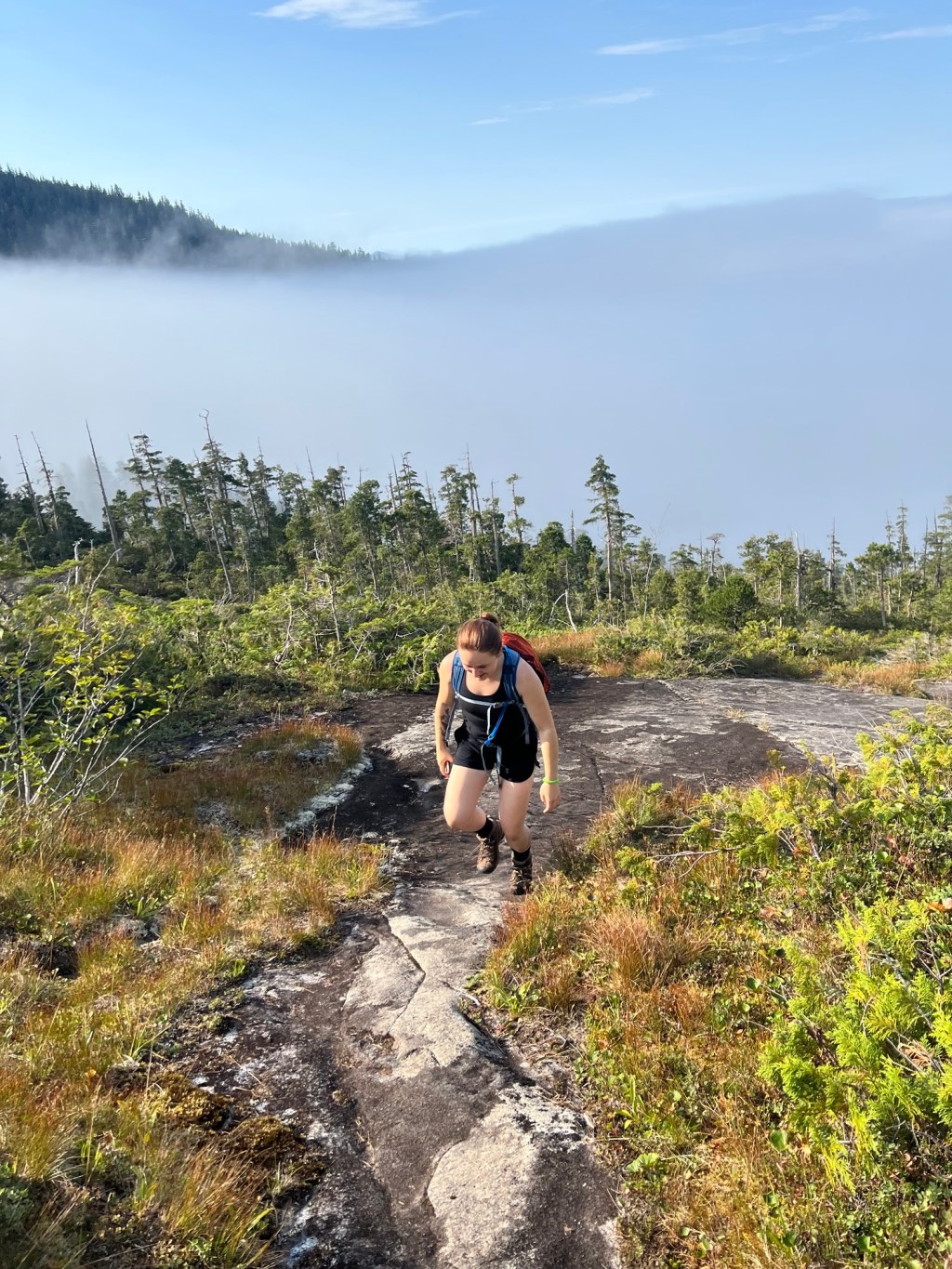 The morning began shrouded in fog, the kind of dense Southeast Alaska mist that clings to your clothes and curls in your hair. We climbed steadily above Carlanna Lake, each step muffled by damp earth, the forest alive with the smell of cedar and rain-soaked moss. It was quiet except for the occasional blue jay or raven call echoing from the trees, as if they were daring us upward.